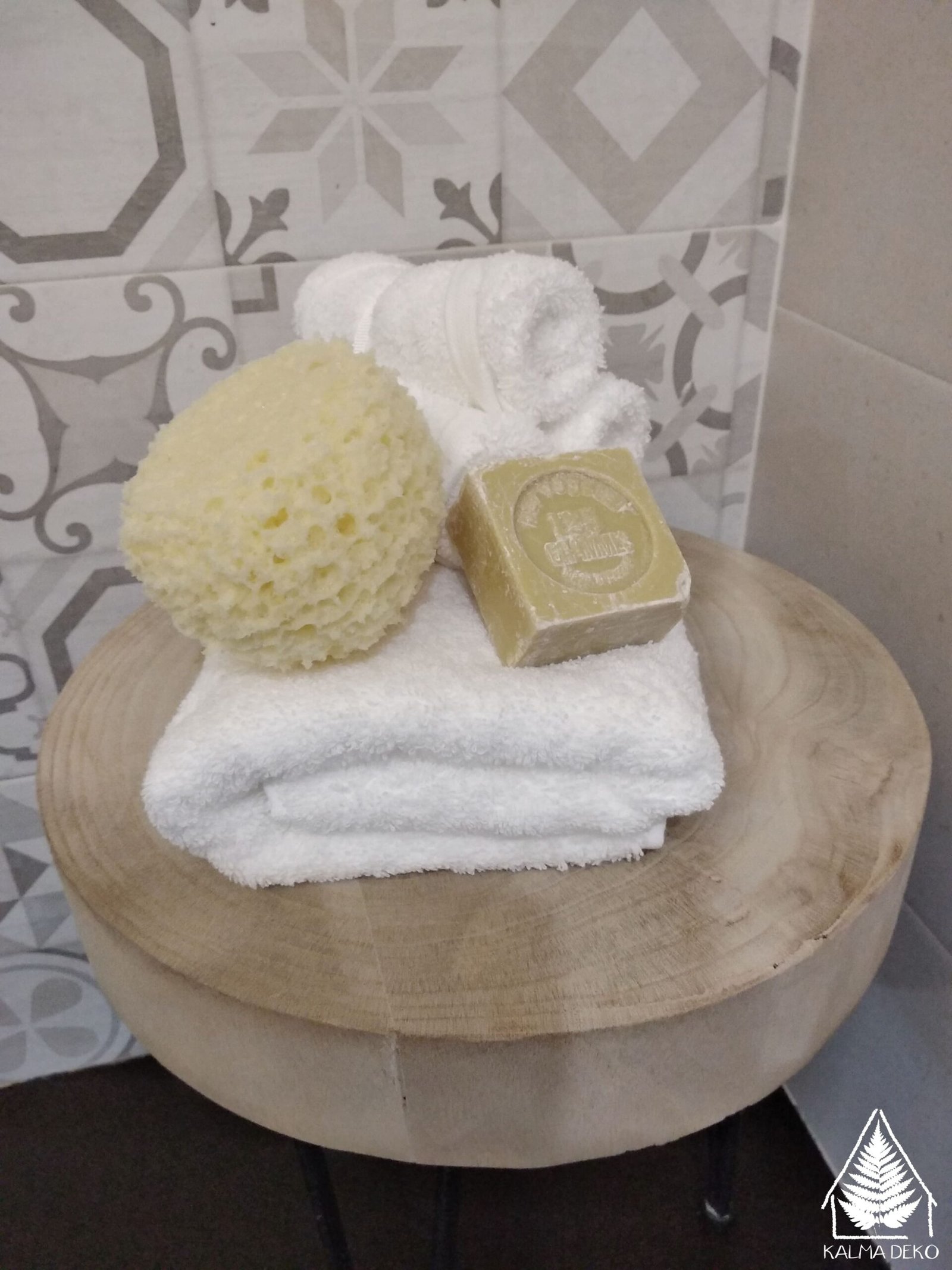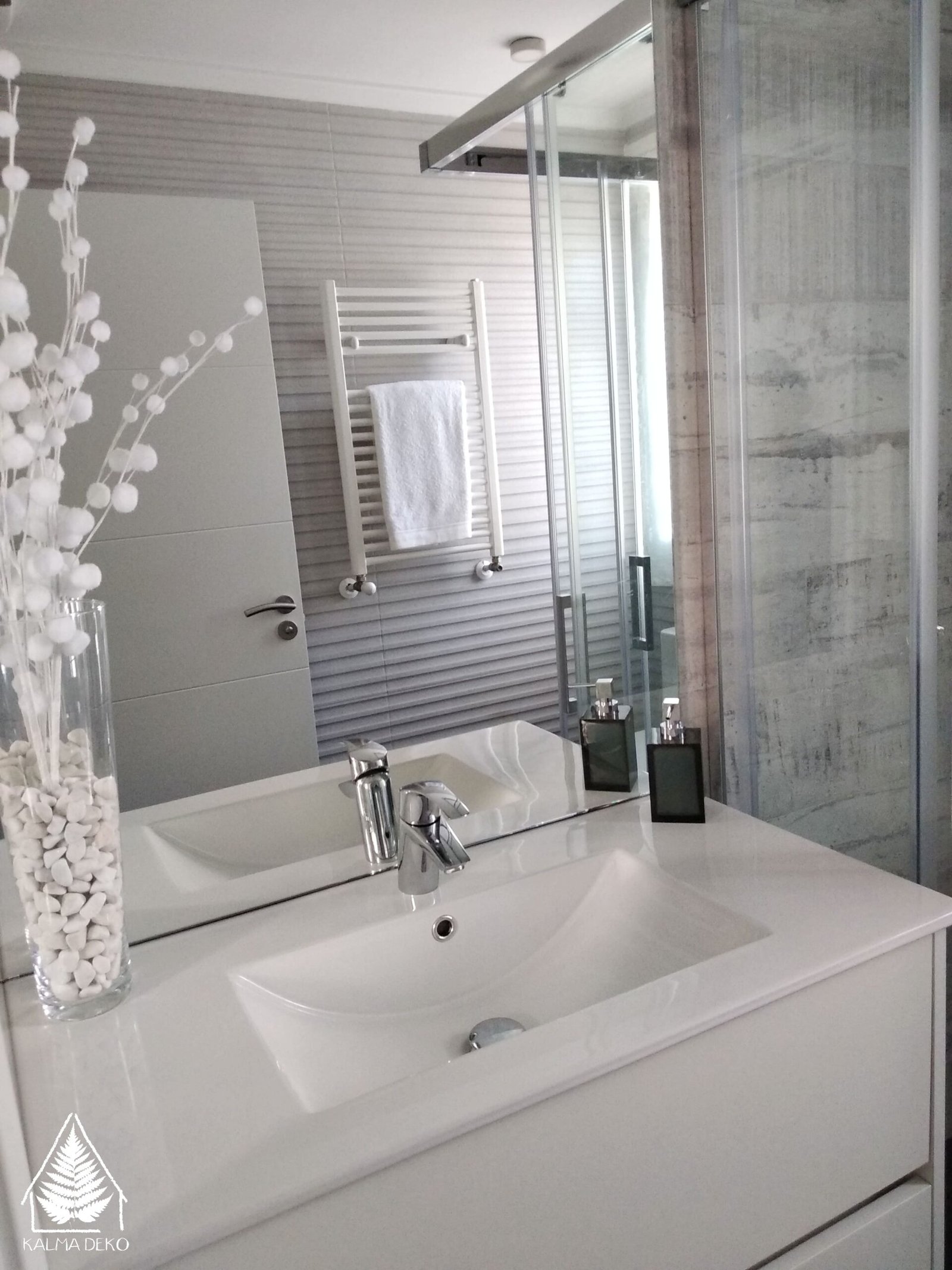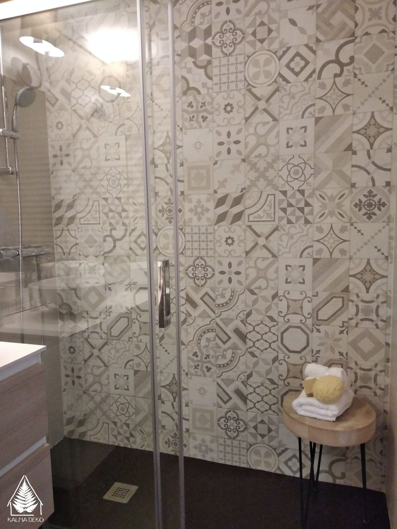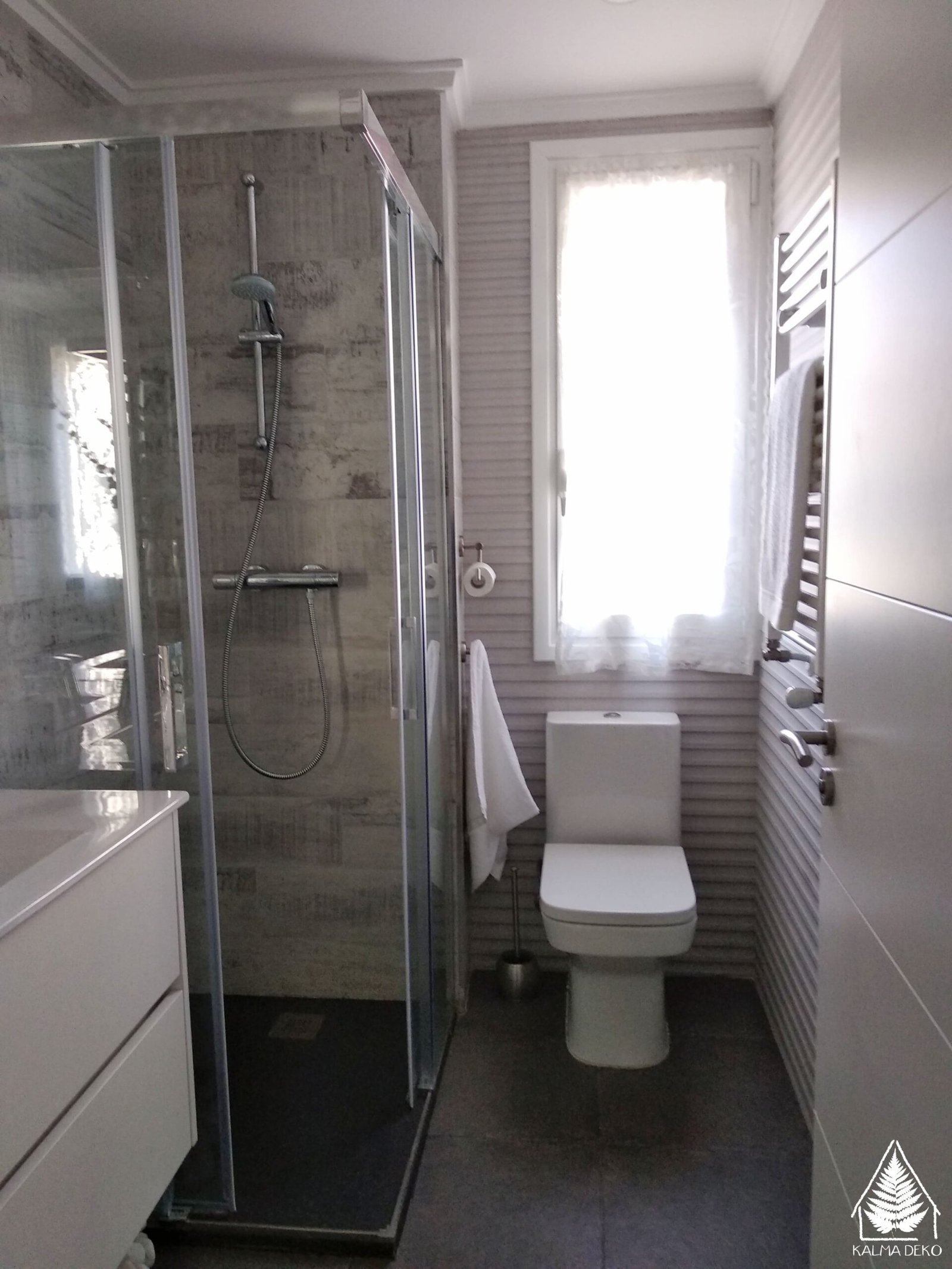 Los colores en tonos tierra suaves del baño, armonizan con las tonalidades del pasillo. Este aspecto, para mí es muy importante y lo tengo muy presente en mis diseños. Dos estancias contiguas tienen mucha conexión visual y cuidar el equilibrio entre las decoraciones de cada espacio crean esa sensación que valoro en KALMA DEKO.
