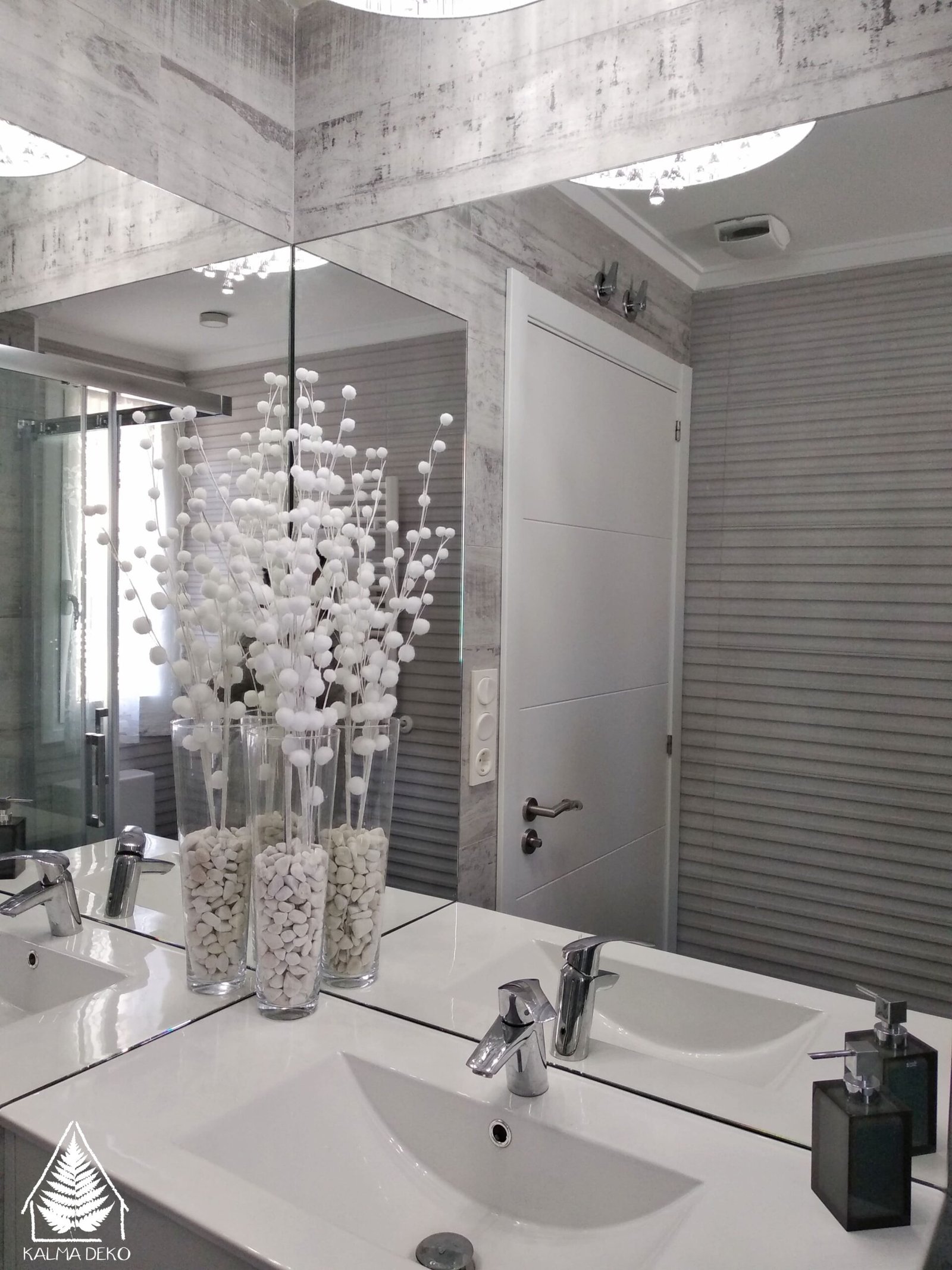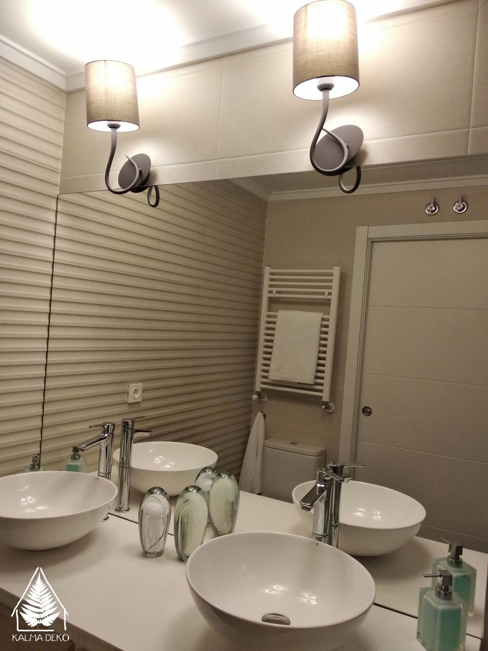 En este baño, también opté por un espejo sin marco, amplio y que abarca el paño frontal y el lateral de la encimera del lavabo. Esta disposición en «L» es un recurso muy sencillo y efectivo para espacios pequeños. La llamativa lámpara que situé encima de él, adquiere mayor protagonismo por los múltiples reflejos que le aportan los espejos situados de este modo. La presencia de elementos ornamentales, puramente decorativos hay que medirla algo más en espacios de pequeñas dimensiones, pero que esto no nos haga creer que estas estancias tengan que ser aburridas o impersonales. Yo siempre te propondré soluciones que nos alejen de ahí!!