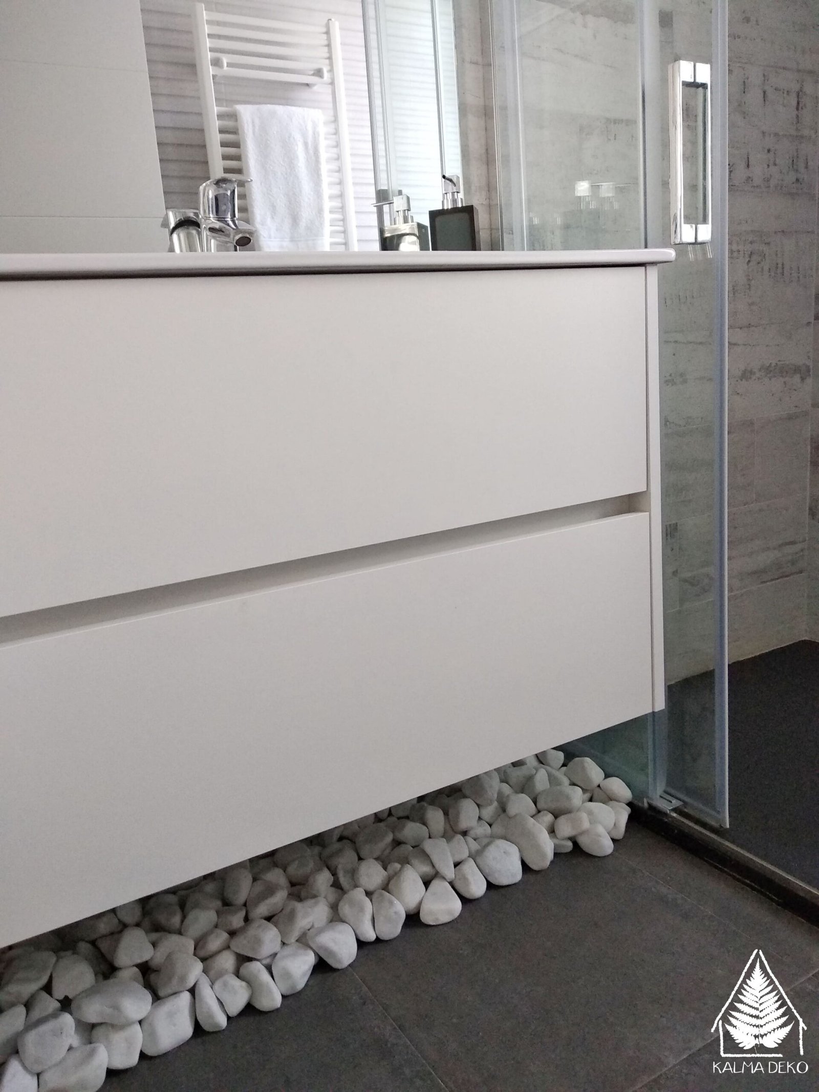 Y para la noche? He instalado unas suaves luces led debajo del mueble que suman un detalle decorativo dando mayor protagonismo a las blancas piedras que iluminan. Nos ayudan a utilizar el baño sin desvelarnos por el exceso de luz y crean un ambiente nocturno realmente sosegado.