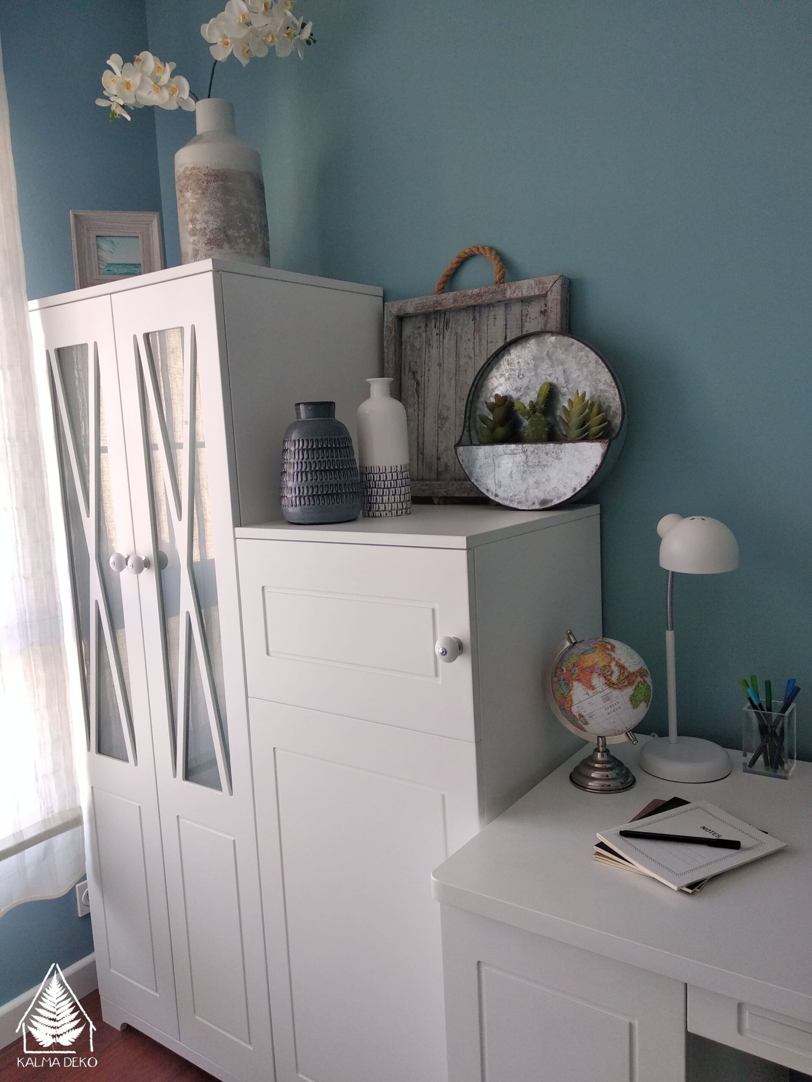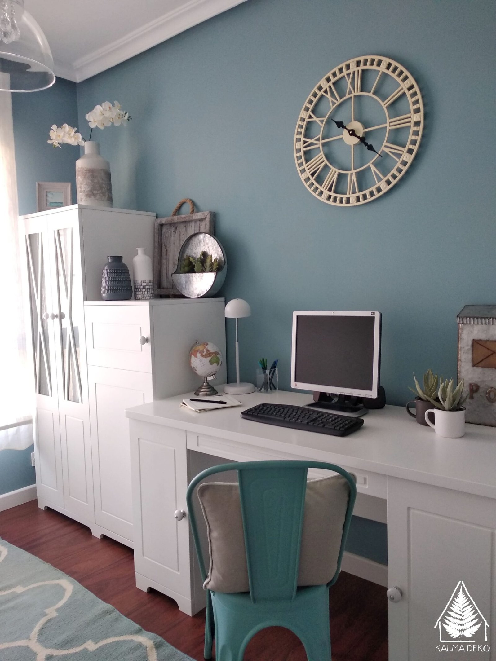 Esta pequeña estancia era anteriormente un dormitorio sin habitar e Ixiar quiso dedicar el espacio a «viajar y viajar». Retiramos la cama barco que había y encargamos un armario blanco a dos alturas. Este detalle hace que visualmente el espacio quede más desahogado. Una gran mesa de trabajo para estar cómoda. La silla que hemos incorporado, ha pasado por nuestro taller. Antes tenía un color blanquecino muy deteriorado y hemos aprovechado para sanearla y darle ese llamativo color que ahora se acopla al nuevo diseño. Los complementos textiles harán que Ixiar sienta mayor calidez y la decoración suma belleza y armonía, algo que ella buscaba.
