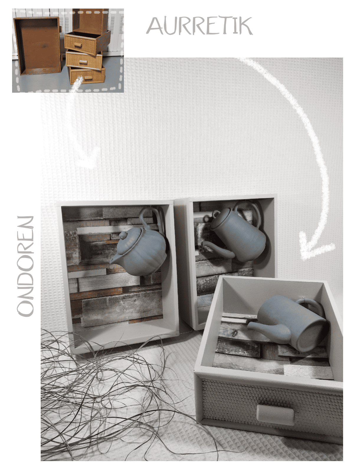 Sobre la mesa unos viejos cajones de un descartado mueble de mimbre y unas cafeteras/teteras llenas de desperfectos y en desuso. A priori parece una mezcla imposible, un maridaje descabellado hasta que vemos el resultado final.