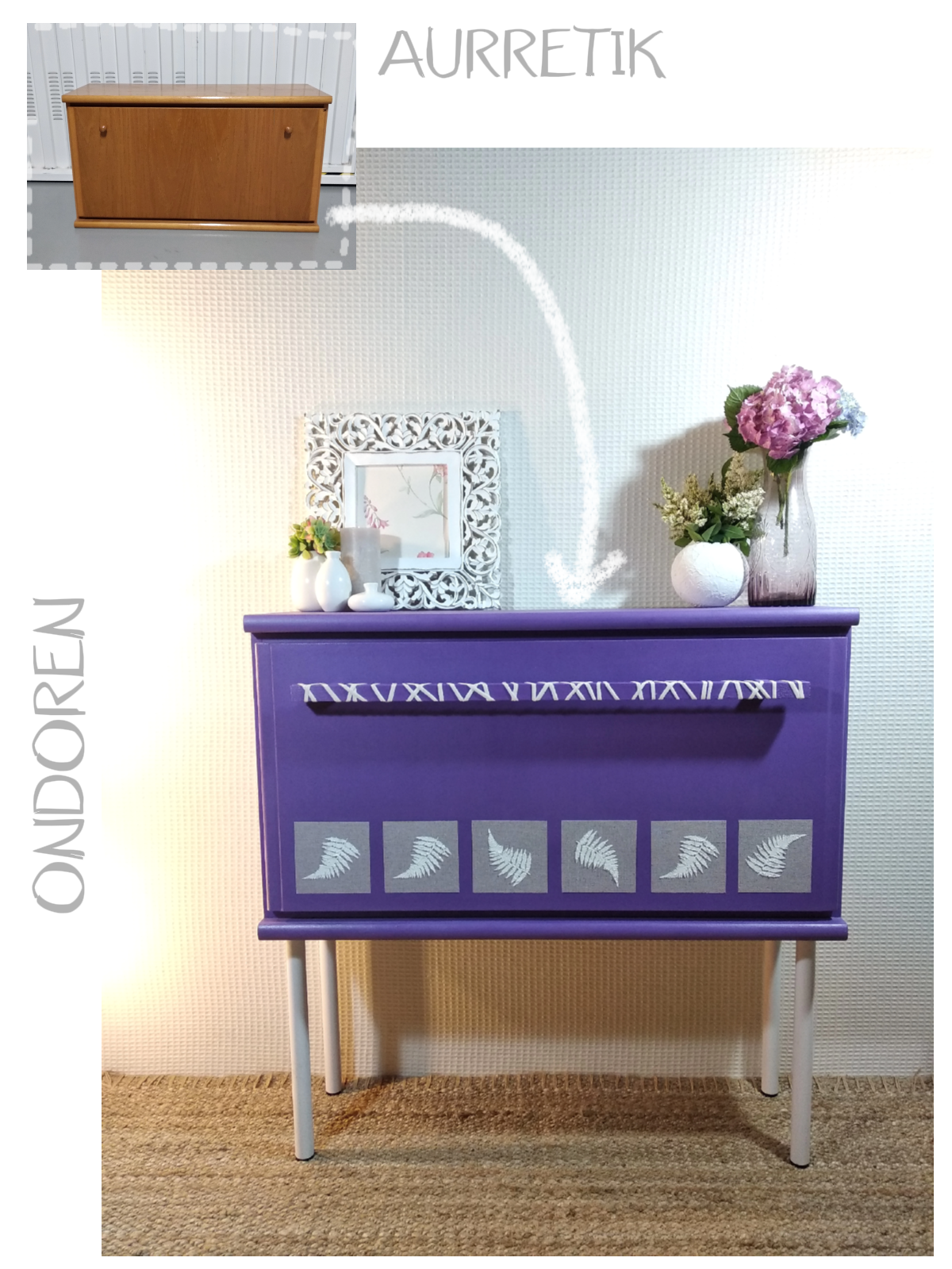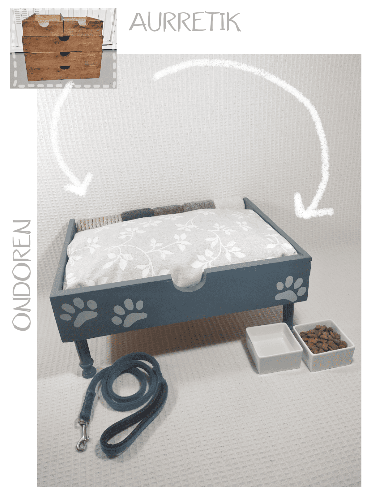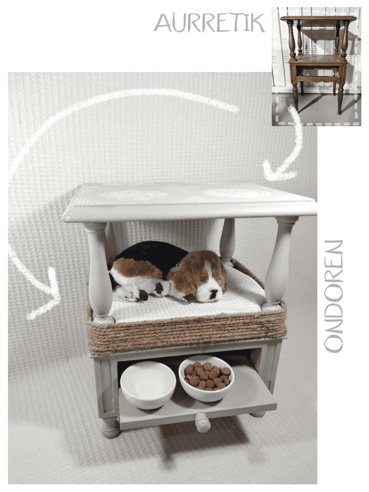 Un suave tono piedra de base, un mullido cojincito lavable como cama, una tabla extraíble en lugar del cajón. Un elegante papel pintado barnizado cubre su parte superior, para sanear el deteriorado sobre y hacerlo resistente de cara al futuro. Y es que, este mueble que ya había agotado su pasado, ahora está lleno lleno de futuro… para dos!