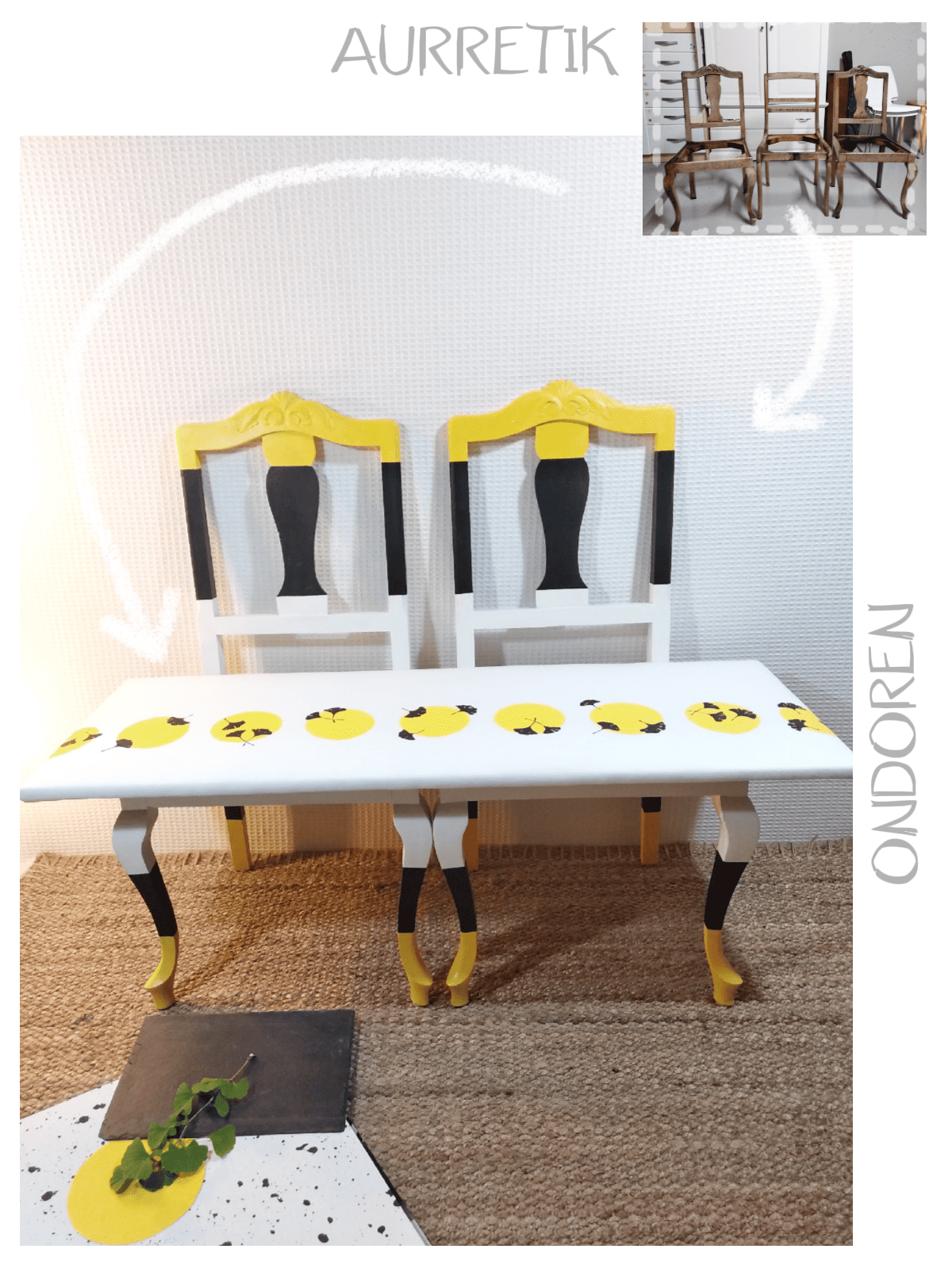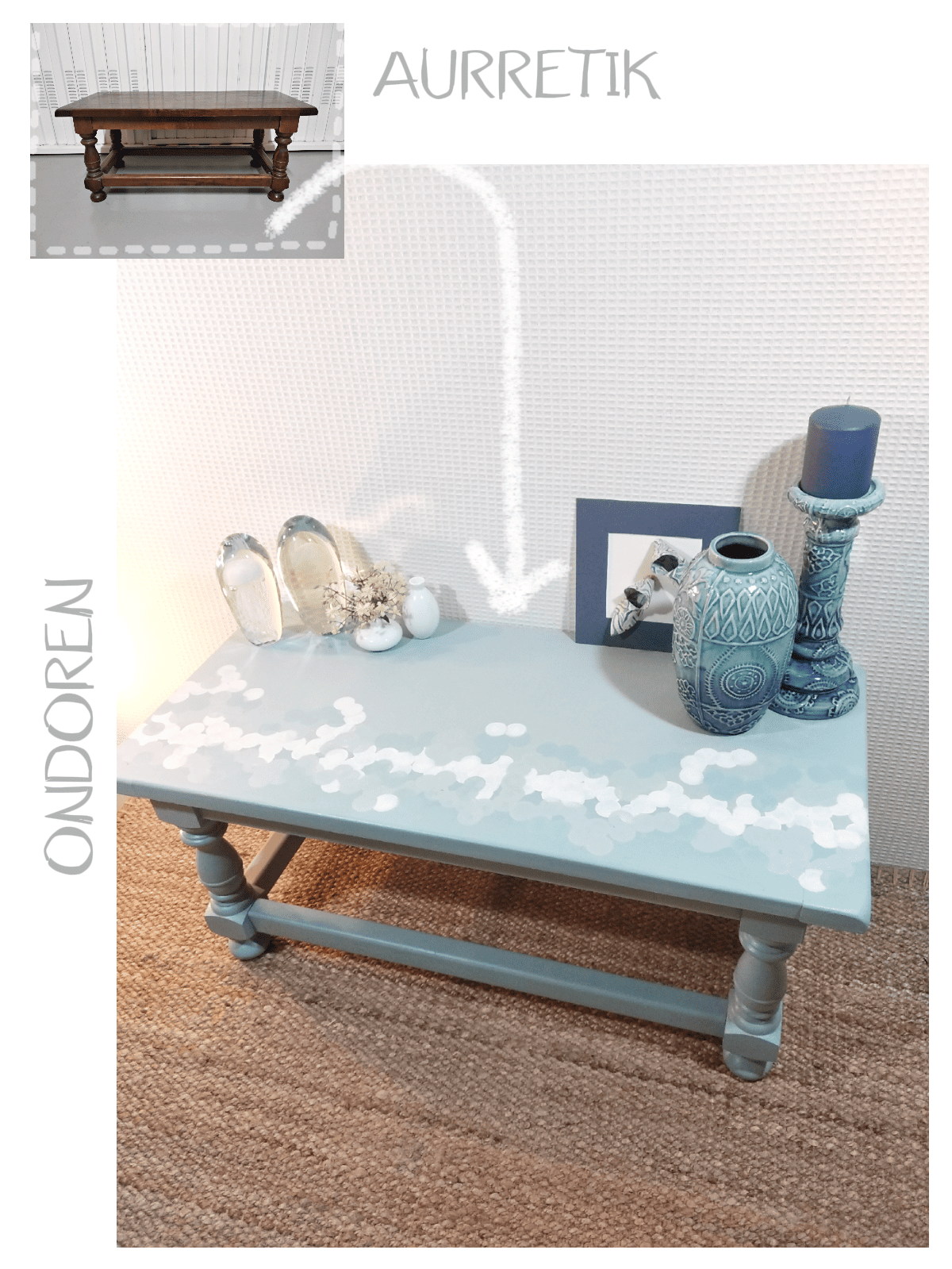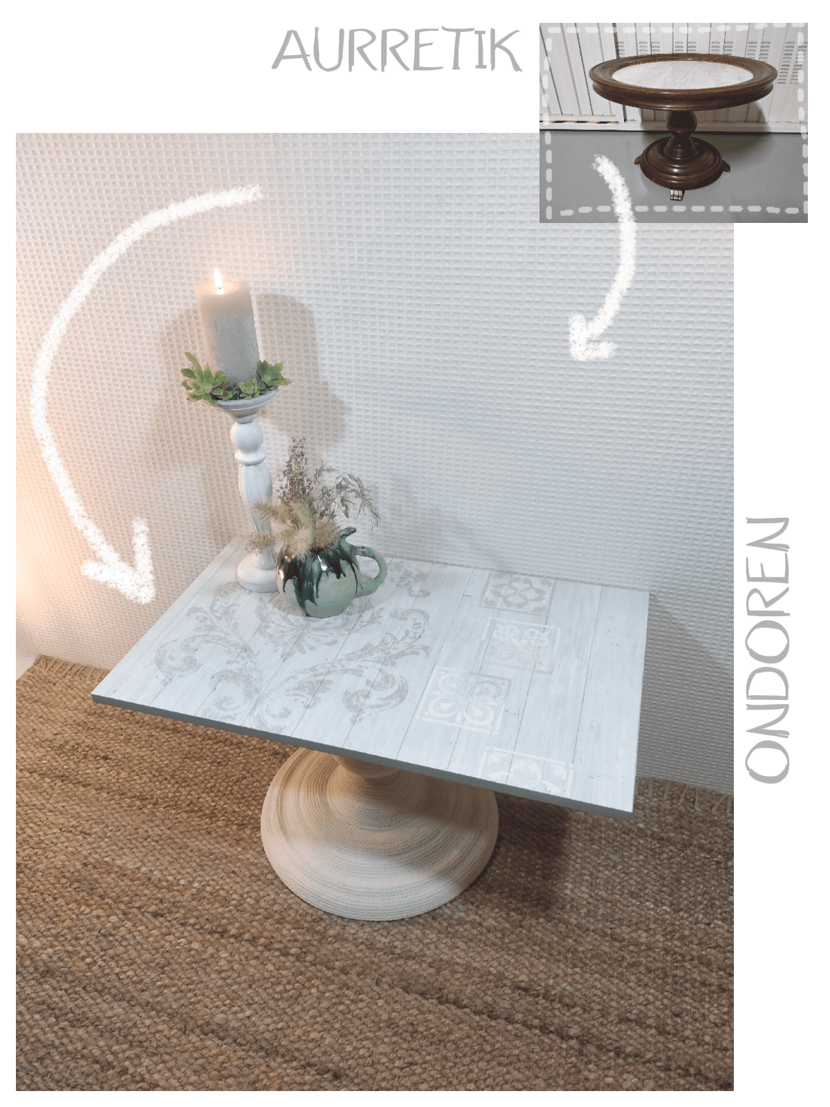 Partiendo de una mesa redonda tan desfasada, oscura, deteriorada, visualmente pesada…quién iba a pensar que podríamos lograr una transformación así? Nosotros lo sabíamos. Teníamos claro que no nos valía con cambiarla de color y poco más. Aquí tocaba ser creativos con la textura (el pie está forrado por una impermeabilizada cuerda), crear una forma nueva rectangular en el sobre, generar un dibujo atractivo en el mismo para dotarla de personalidad…