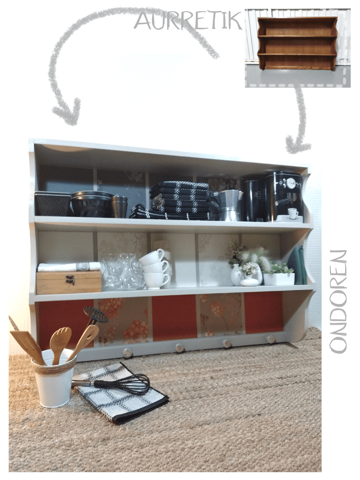 Ahora tiene un suave tono piedra de base y juega armoniosamente con un fondo de papel pintado en tonos grises y naranjas. Hemos reparado los desperfectos estructurales y ha quedado robusta para aguantar todo el peso que necesitemos incorporar. Puedo imaginlo en una cocina llenos de bonitos botes, en un comedor luciendo una vajilla, en un dormitorio infantil albergando libros y cuentos, en un recibidor aprovechando sus colgadores…En ese viejo mueble del agonizante pasado, hoy y mañana habrá mucha más vida!