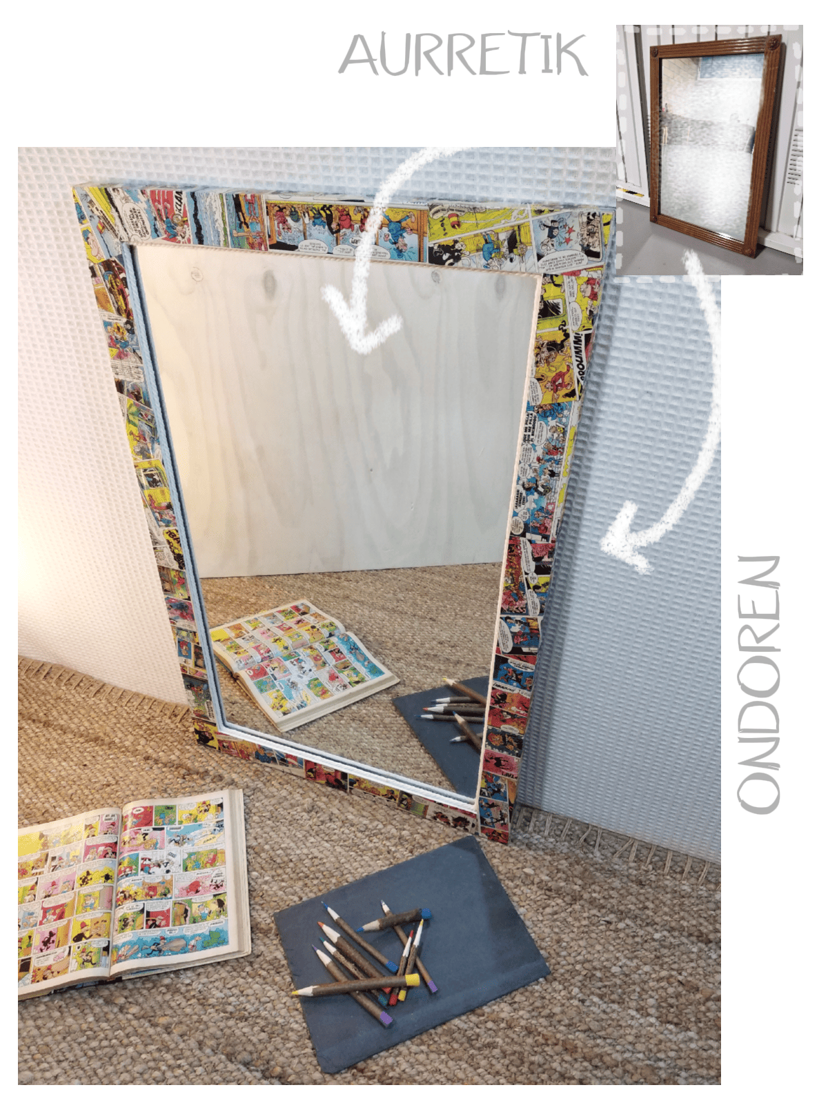 Así que, se nos ocurrió actualizarlo con otro elemento que estaba también para tirar, un viejo cómic. Es difícil entender la curiosa relación que hay entre Mortadelo y Filemón, pero funciona. Pues algo parecido le ha ocurrido a este espejo recubierto de las viejas páginas de un tebeo, parece una extraña pareja, pero hacen un original y bien avenido tándem.