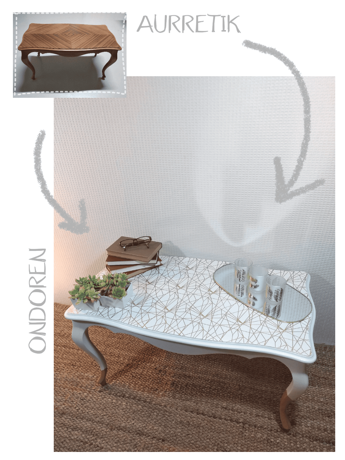 …nos habría contado lo útil que ha sido durante tantos años, pero que está agotada! Que le flojean las patas, se le desprende la chapa del sobre, que ya no se ve conviviendo con una actual alfombra, un sofá moderno, unos jarrones frescos…y tiene razón. Ha hecho un buen trabajo hasta ahora y lo que no sabe, es que seguirá haciéndolo con nuestra transformación. Queremos ligereza con el blanco, atrevimiento con el diseño irregular de sus patitas y modernidad con las geométricas líneas doradas de su sobre. Su acabado es lo suficientemente neutro como para poder encajar en muchos ambientes actuales, al mismo tiempo que posee ahora una gran personalidad.