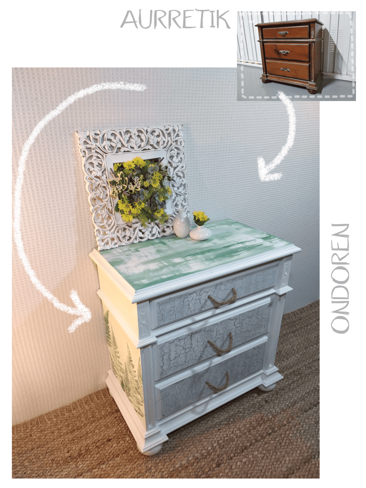 De base, toca aligerar la pieza con un blanco roto. He decorado la parte superior con un falso decapado en verdes y un craquelado para los cajones. Estas dos técnicas son ideales para superficies que están  muy deterioradas y que vayan a tener mucho roce. Asas de cuerda de y laterales impresos con helechos.