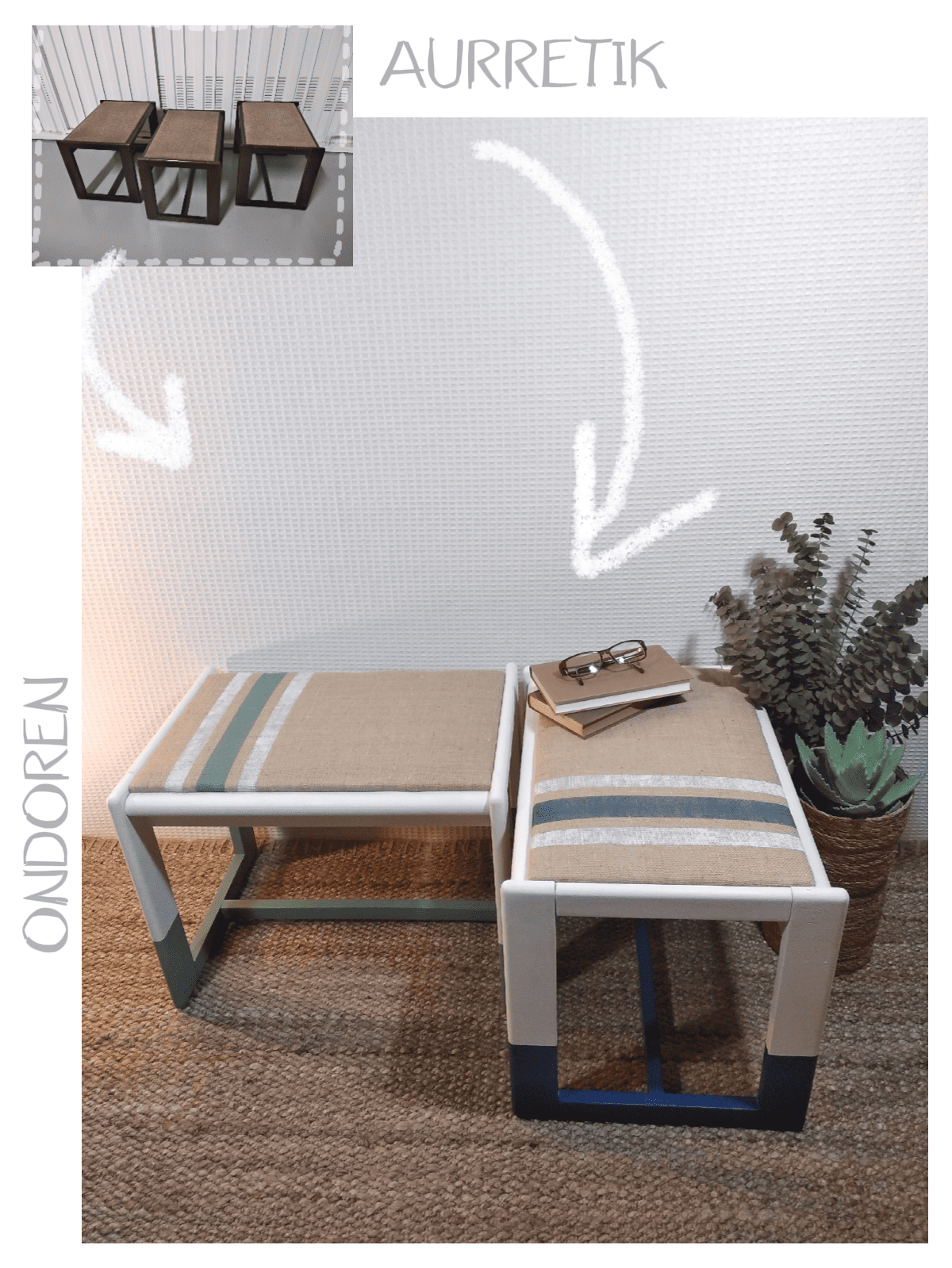 Resultó que era cierto, guardaban todo ese potencial . Cambiarlas de color y hacerles un nuevo tapizado fueron la clave. En este caso he utilizado una tela de arpillera que hemos decorado con unas líneas de color. Así me aseguro que resultarán útiles como asientos, al mismo tiempo que este textil duradero les permitirá funcionar como mesitas.