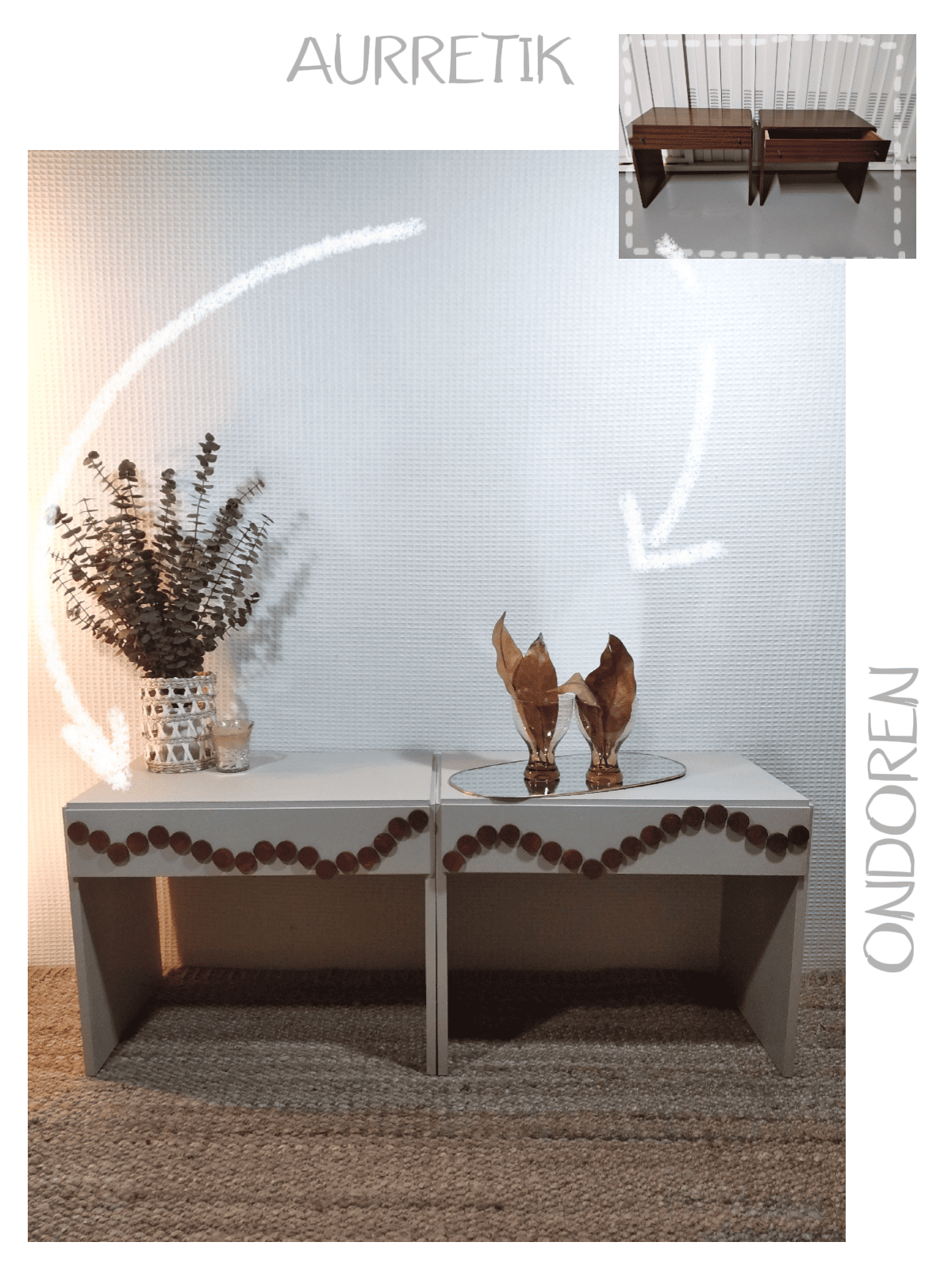 Quisimos experimentar con una pintura de color arena para quitar peso visual al mueble y una textura que adoramos: el acero corten y sus dibujos caprichosos del óxido. La combinación queda actual y ahora esta pareja de mesillas seguirá junta por mucho tiempo.